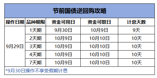 操作方面,第一步,9月29日购买9月30日到期的1天期国债逆回购,可计息9天;第二步,9月30日到期可用资金买入债券类ETF,再享受假期票息收益。