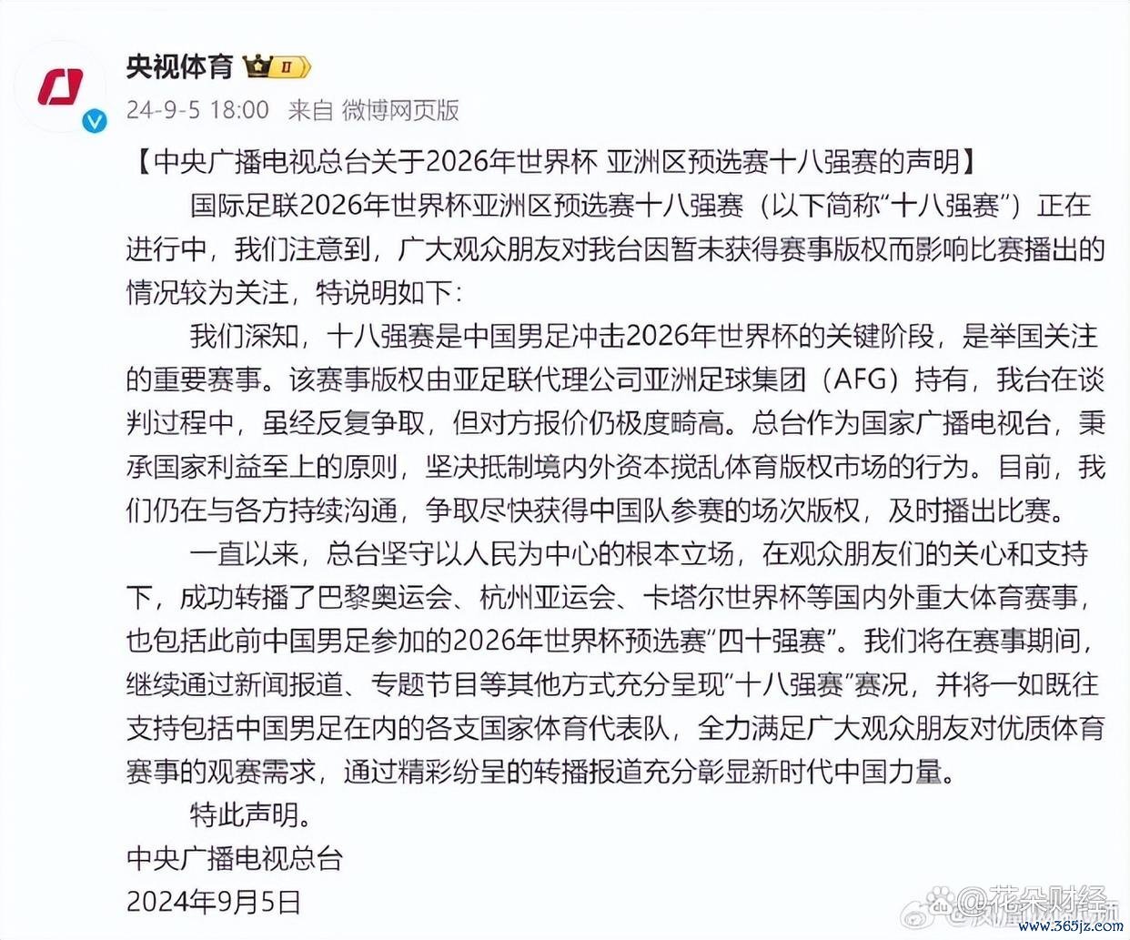 早一些时候,有不少球迷、网友好奇讨论“央视cctv5为何不转播国足”,随着讨论的深入,去年9月5日,央视一则声明浮出水面。“央视体育”当时表示:“我们深知,十八强赛是中国男足冲击2026年世界杯的关键阶段,是举国关注的重要赛事。该赛事版权由亚足联代理公司亚洲足球集团(AFG)持有,我台在谈判过程中,虽经反复争取,但对方报价仍极度畸高。总台作为国家广播电视台,秉承国家利益至上的原则,坚决抵制境内外资本搅乱体育版权市场的行为。目前,我们仍在与各方持续沟通,争取尽快获得中国队参赛的场次版权,及时播出比赛。”