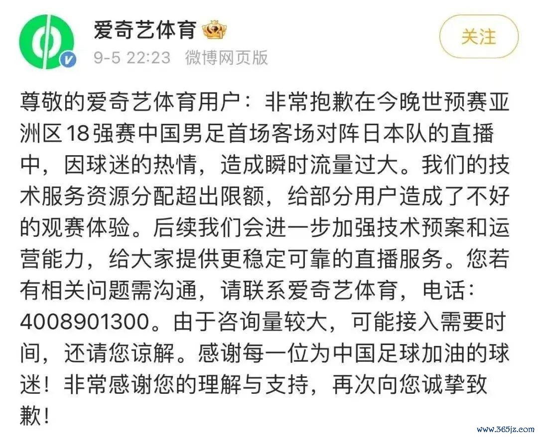 不过,作为独家直播平台的爱奇艺体育,在一开始并没有完美接住这波泼天的流量。9月5日,中国男足在世预赛亚洲区18强赛首场比赛以0比7创历史最大比分输球。尽管赛事由爱奇艺独家买断转播权,但花钱的用户感受一般,开赛后“爱奇艺花钱看不了”话题突然引爆社交媒体热搜。