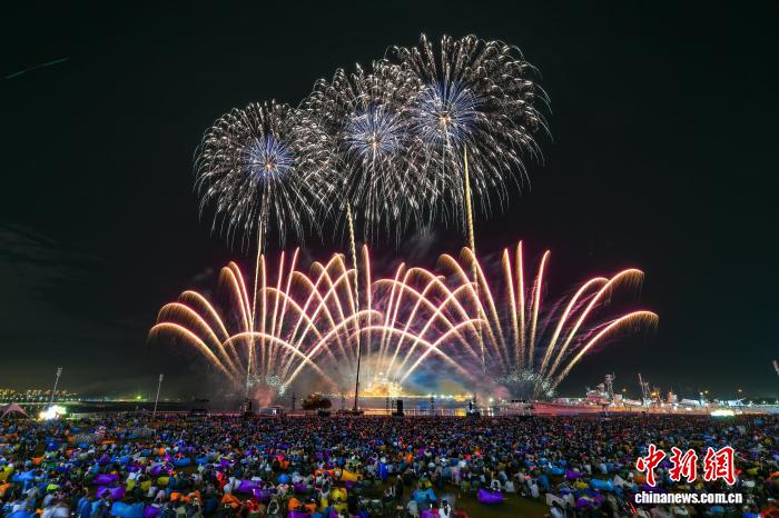 图为10月2日晚,市民和游客在天津泰达航母主题公园观看焰火秀。记者 佟郁 摄